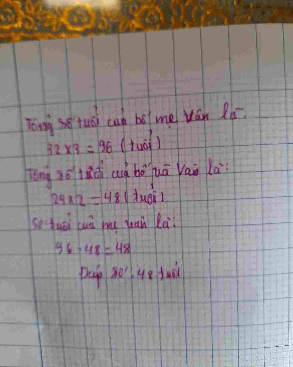 Toán Lớp 4: Trung bình cộng số tuổi của bố, mẹ và Vân là 32 tuổi. Nếu không tính tuổi mẹ thì trung bình cộng số tuổi của bố và Hoa là 24. Hỏi mẹ Hoa bao nhiêu tuổi ?