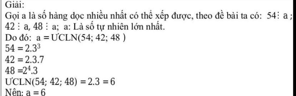 Toán Lớp 6: lớp 6a có 54 học sinh , lớp 6b có 42 học sinh và lớp 6c có 48 học sinh . Trong ngày khai giảng , 3 lớp xếp thành các hạng dọc như nhau đẻ diễu hành mà không lớp nào có người lẻ hàng .
