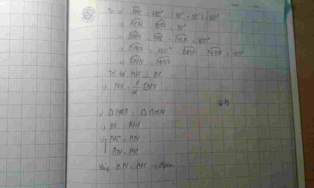 Toán Lớp 7: Cho ΔABC có góc ABC = 500; góc BAC = 700. Phân giác trong góc ACB cắt AB tại M. Trên MC lấy điểm N sao cho góc MBN = 400. Chứng minh rằng: BN = MC.