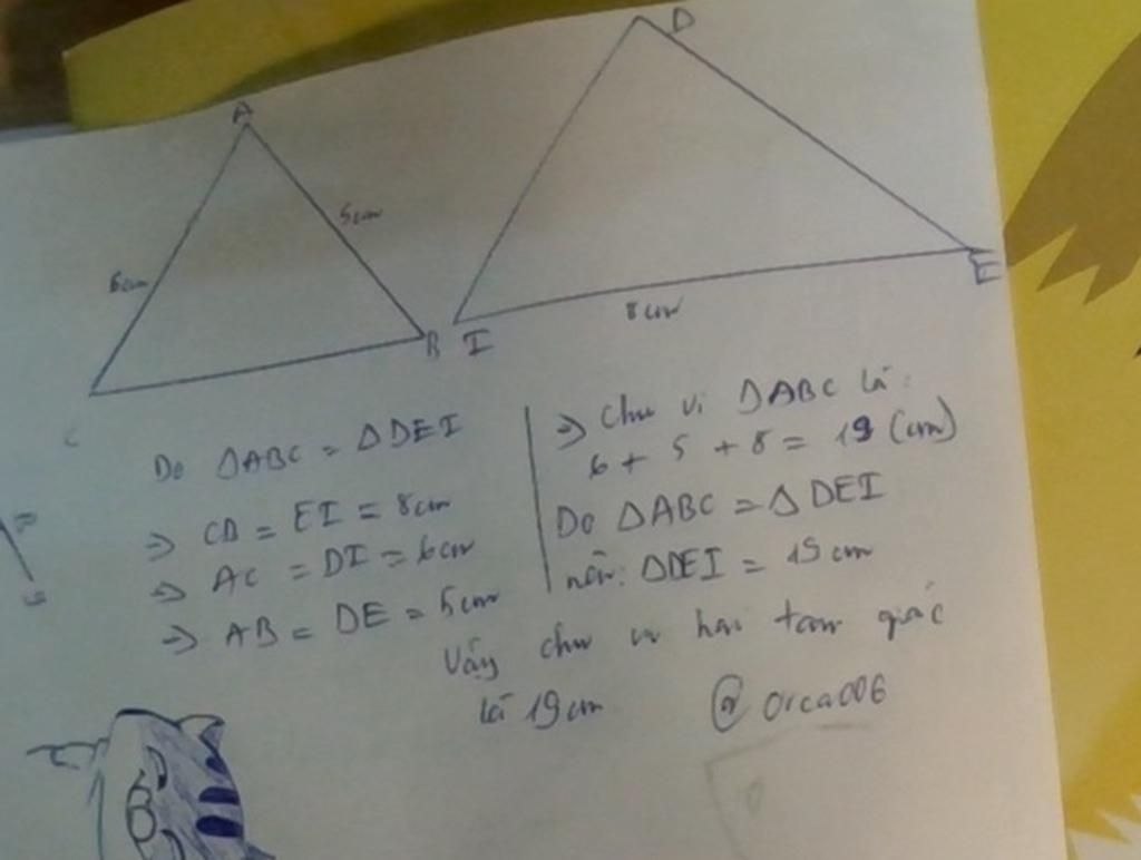 Toán Lớp 7: Cho tam giác ABC = tam giác DEI, biết AB = 5 cm, AC = 6 cm, EI = 8 cm. Tính chu vi của mỗi tam giác