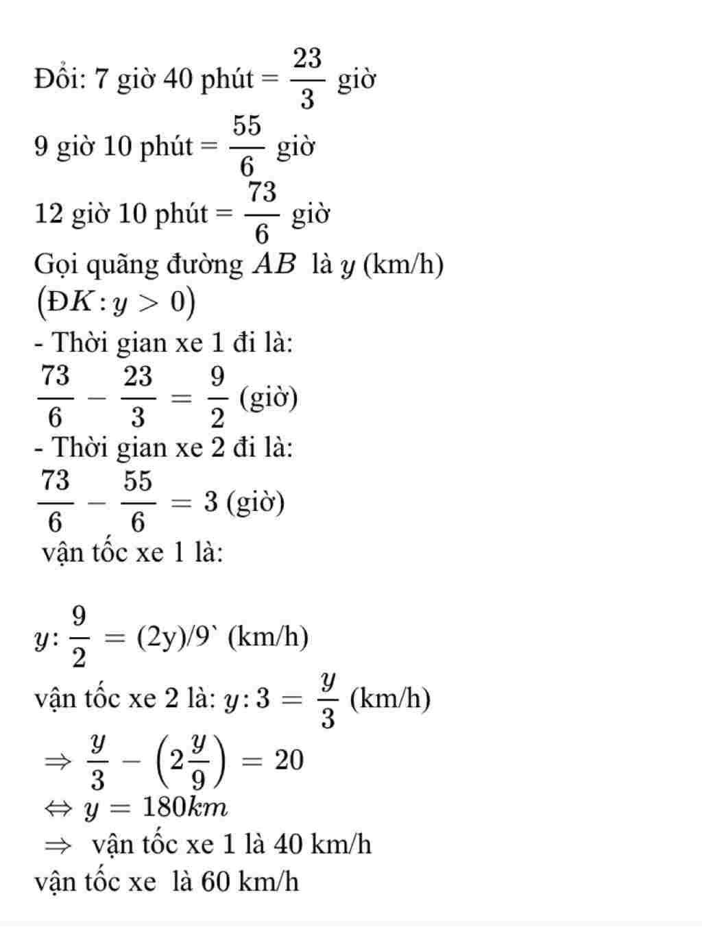 vận tốc xe 2 là: y : 3 = y/3 (km/h)