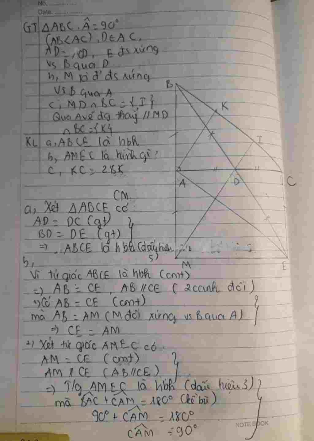 b/Gọi M là điểm đối xứng của B qua A. Tứ giác AMEC là hình gì? Vì sao?