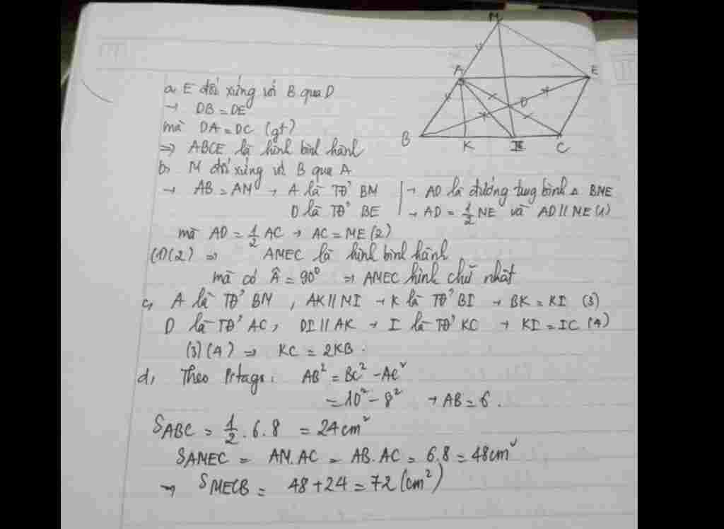 Toán Lớp 8: Câu 4: Cho ∆???????????? vuông tại A ( AB < AC). Gọi D là trung điểm của AC . Lấy E là điểm đối xứng với B qua D.