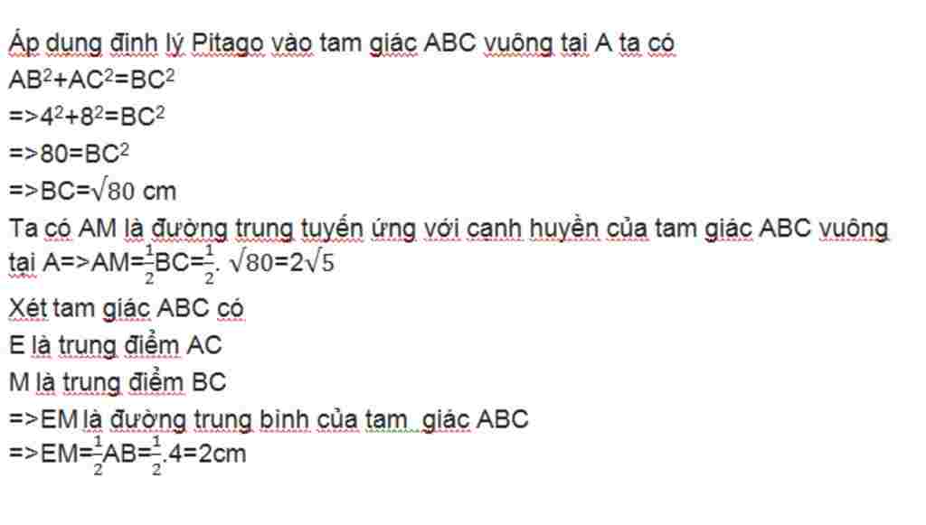 Toán Lớp 8: Cho tam giác ABC vuông tại A, AB = 4cm, AC = 8cm. Gọi E là trung điểm của AC và M là trung điểm của BC. Tính EM và AM?