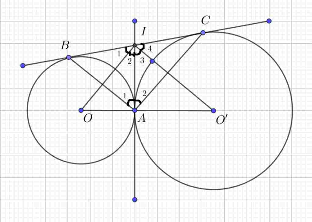 Toán Lớp 9: Cho 2 đường tròn (O) và (O’) tiếp xúc ngoại tại A. Kẻ tiếp tuyến chung ngoài BC, B thuộc (O), C thuộc (O’). Tiếp tuyến chung trong tại A cắt tiếp tuyến chung ngoài BC ở I.