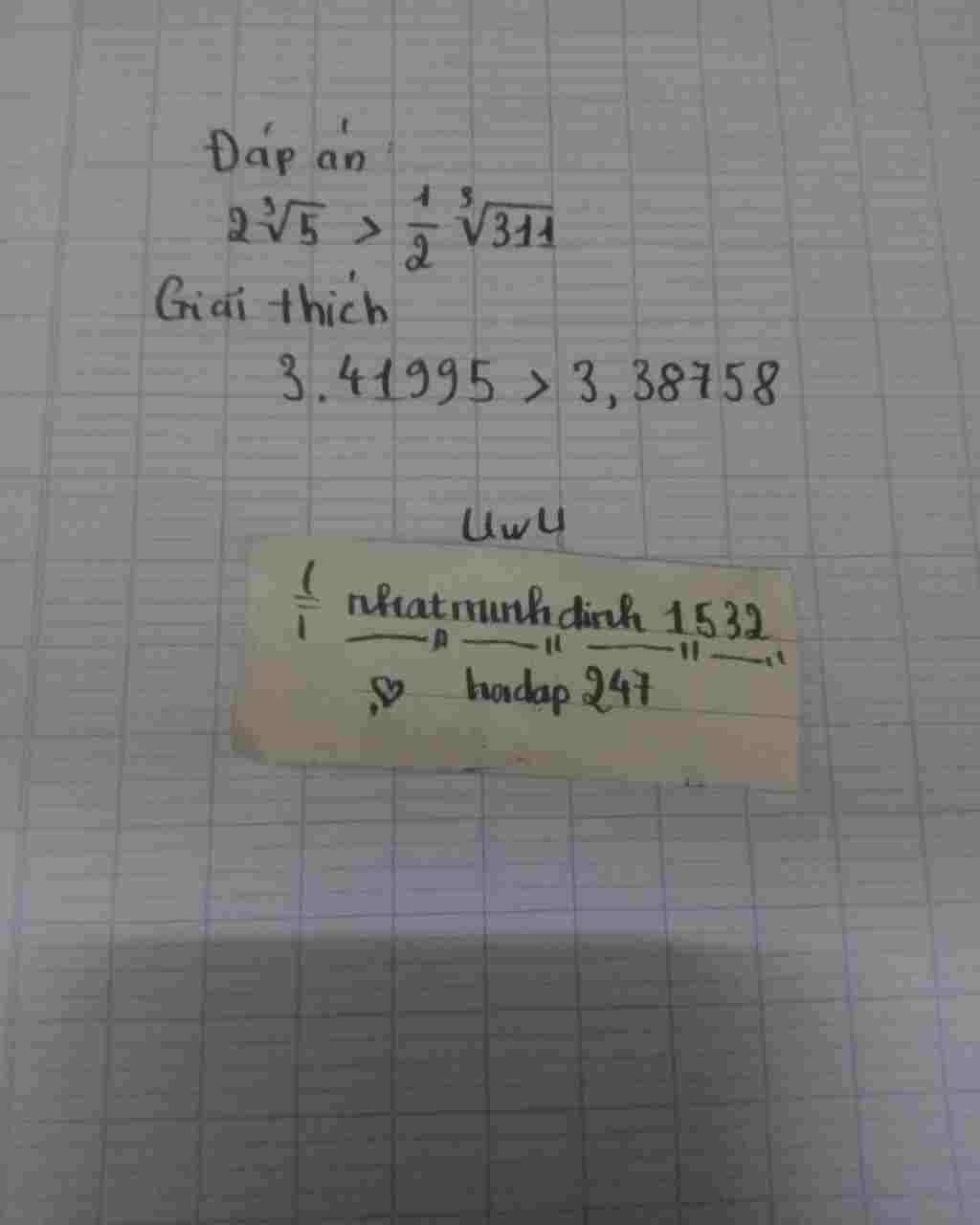 Toán Lớp 9: So sánh : 2 $\sqrt[3]{5}$ và $\frac{1}{2}$ $\sqrt[3]{311}$